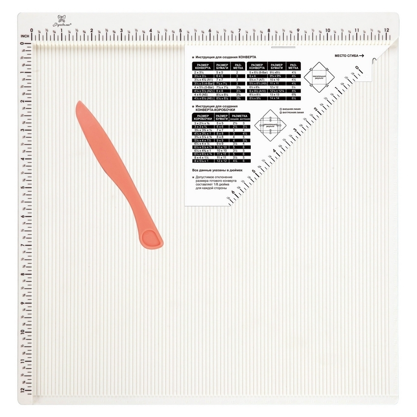 В набор входит доска для биговки размером 30,5 х 30,5см , линейка-треугольник, палочка для сгибания бумаги, инструкция с доступными и понятными схемами-картинками